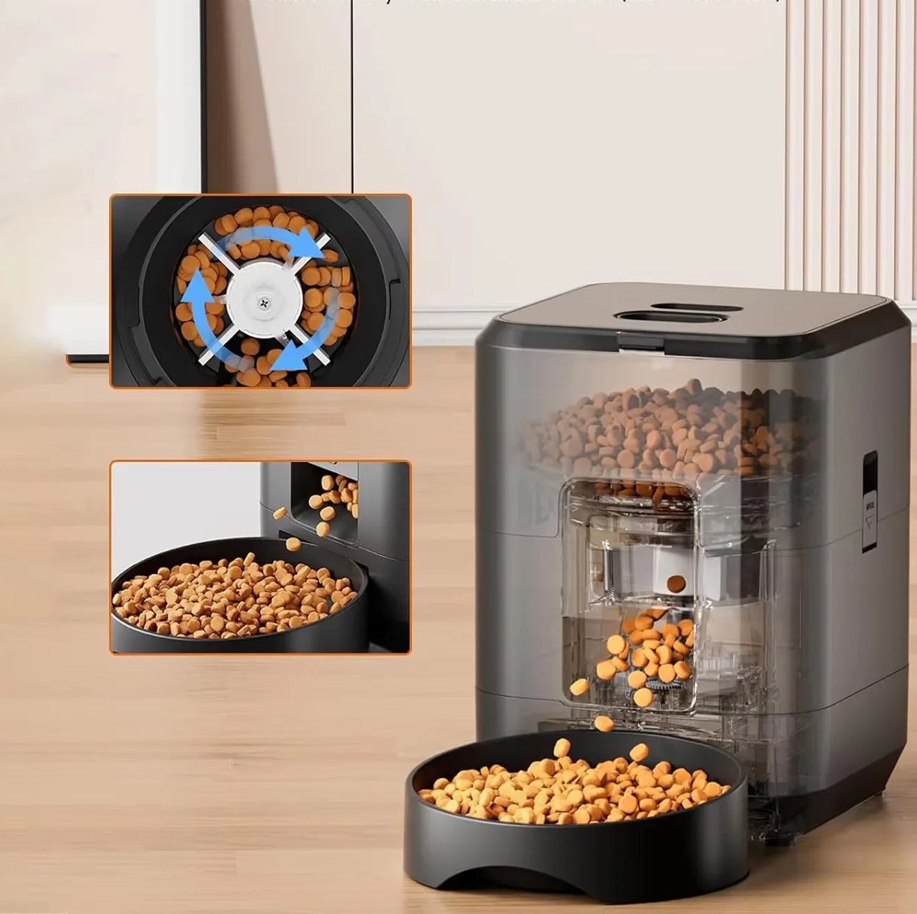• Control din aplicație (Wi-Fi) – programezi porțiile și orele, vezi istoricul hrănirilor, declanșezi porții manual.