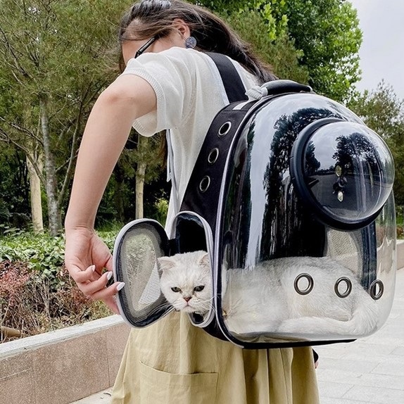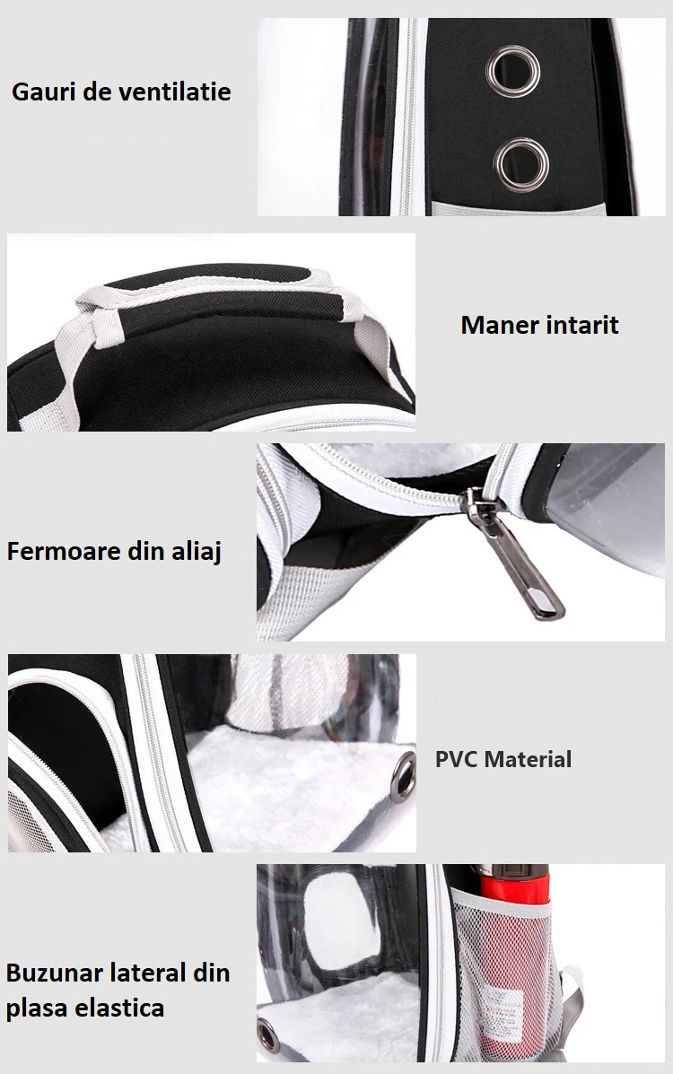 Transporta-ti animalul de companie in siguranta si confort cu acest rucsac transparent pentru pisici si caini de talie mica. Designul modern tip „capsula” ii ofera patrupedului tau vizibilitate deplina, reducand anxietatea si facand calatoriile mai placute.