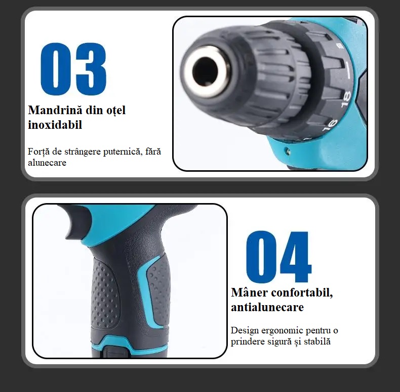Mandrină metalică cu prindere rapidă (ratchet chuck) – asigură fixarea stabilă a burghiilor fără alunecare.