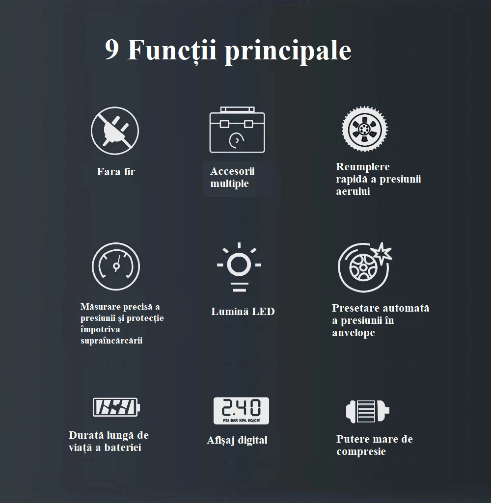 Compresor auto portabil 10 bari cu baterie reincarcabila 5200 mAh, afisaj digital si lumina LED. Pompa multifunctionala pentru masina, motocicleta, bicicleta si mingi. Design compact, fara fir, cu oprire automata la atingerea presiunii setate.