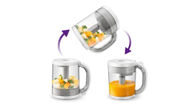 Vei găsi tot ceea ce-ţi trebuie pentru a pregăti mâncăruri nutritive pentru bebeluş într-un singur vas. După ce ingredientele sunt preparate la abur, nu mai trebuie decât să ridici vasul, să-l răstorni şi să-l blochezi pe poziţie, pentru a putea amesteca până obţii consistenţa dorită.