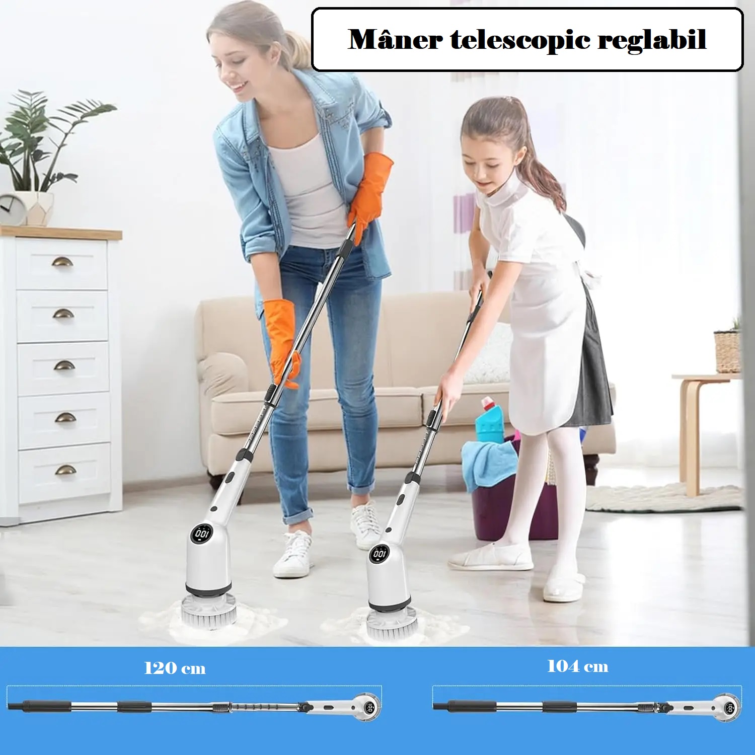 Perie electrică de curățare 9 în 1 cu acumulator, 2 viteze, mâner extensibil și 9 accesorii pentru baie, bucătărie și mașină. Ideală pentru curățare eficientă fără efort.