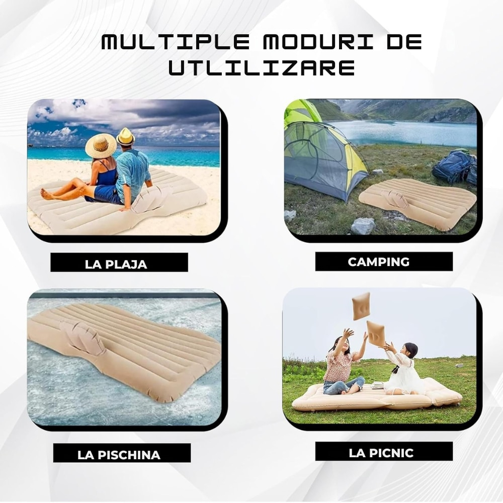Saltea gonflabila auto pentru bancheta spate, cu pompa electrica si perne incluse. Confort, siguranta si odihna la drum lung sau camping.